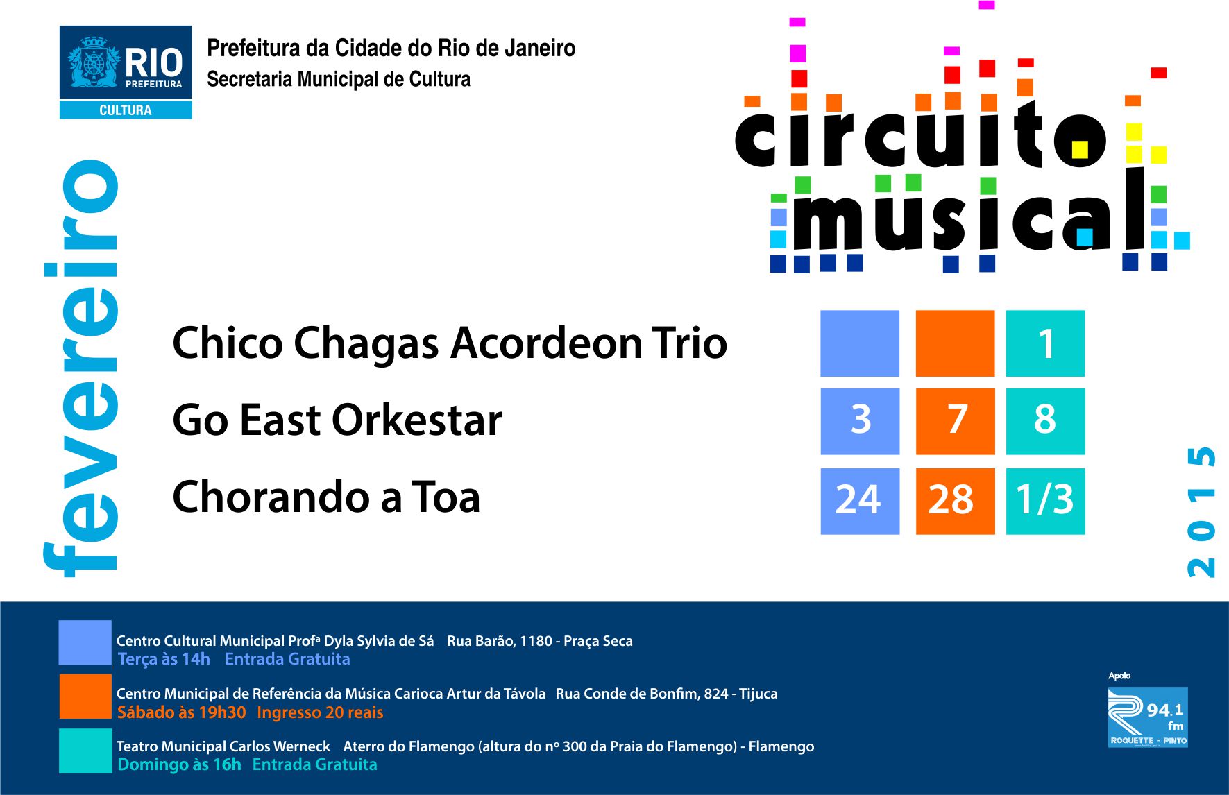 Nos dia 3, 7 e 8 de fevereiro teremos a apresentação do projeto Go East Orkestar no Circuito Musical. Clique no mural para ver os locais e datas das apresentações. Não percam!